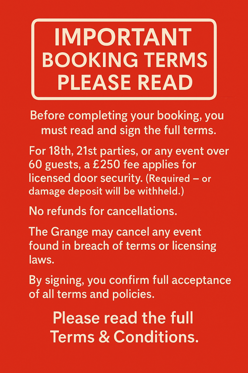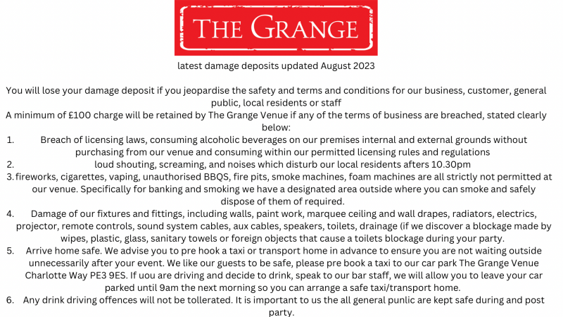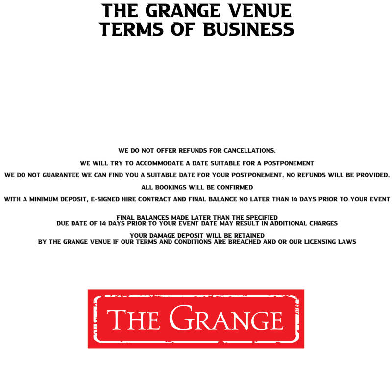 Strictly NO Fireworks on our premises without written consent from The Grange Management. Damage deposit in full will be retained by The Grange Venue if fireworks or smoke machine (s) are used without authorised consent.
